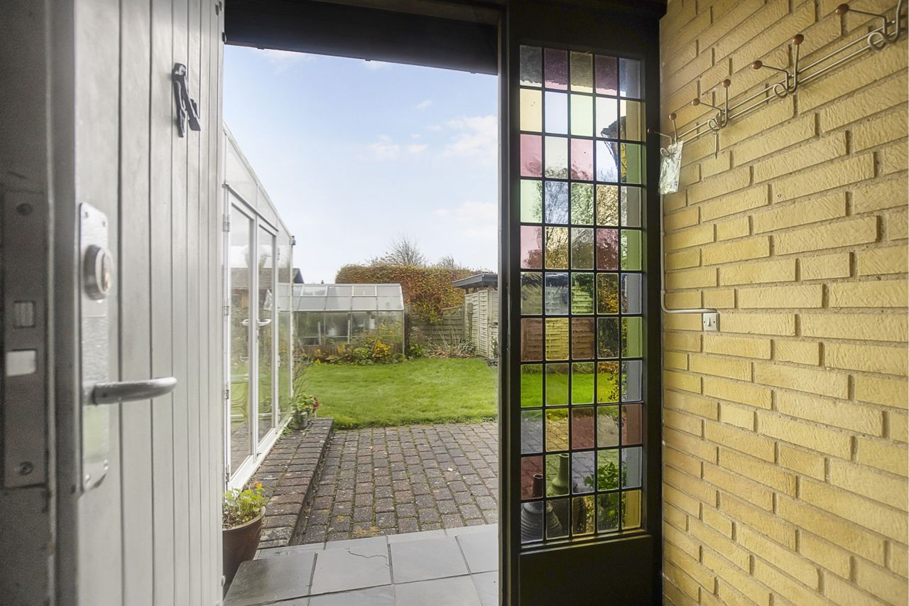 Både carport og garage venter, når I ankommer til adressen, mens en flisegang fører mod den hyggelige
