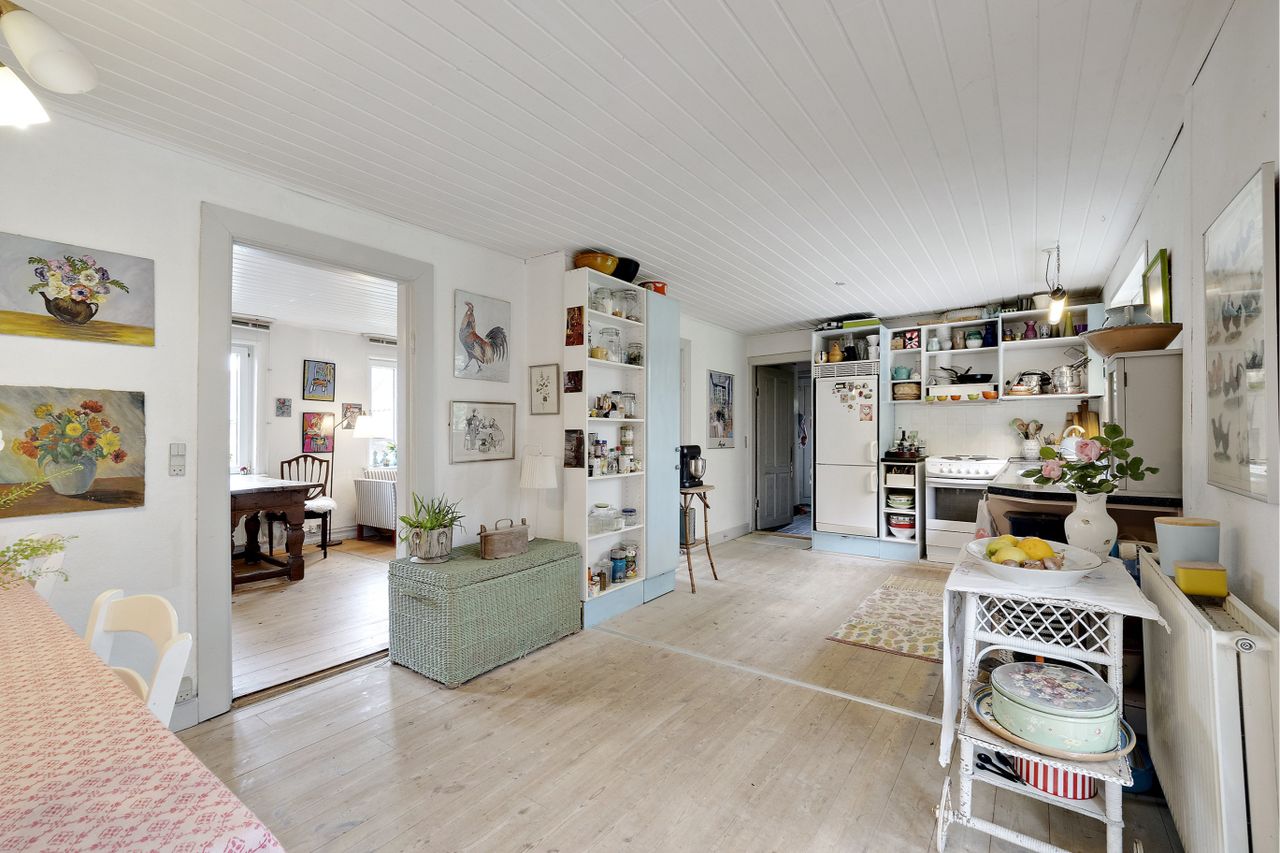 Stueplan er indrettet med entre, stor stue med flotte trægulve, brændeovn og trappe til 1. sal. Stort