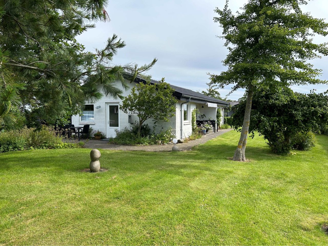 Grund udlagt med indkørsel, bed og plæne omkranset af hæk. Have med plads til udendørsaktiviteter.