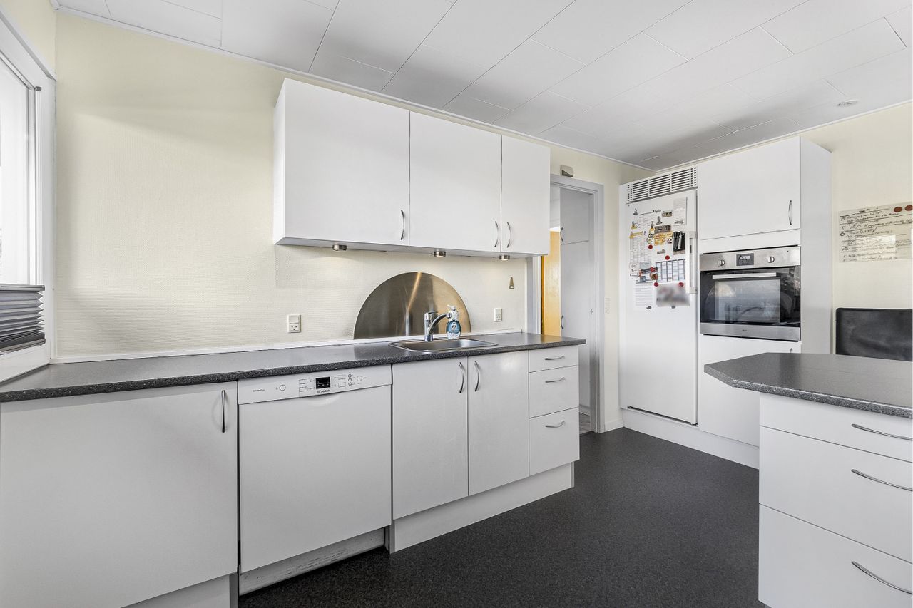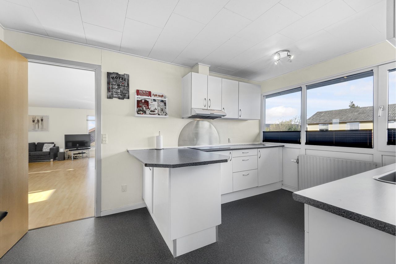 Entre, flot lyst køkken, toilet, stor vinkelstue med stort vinduesparti med et godt lysindfald og udgang til