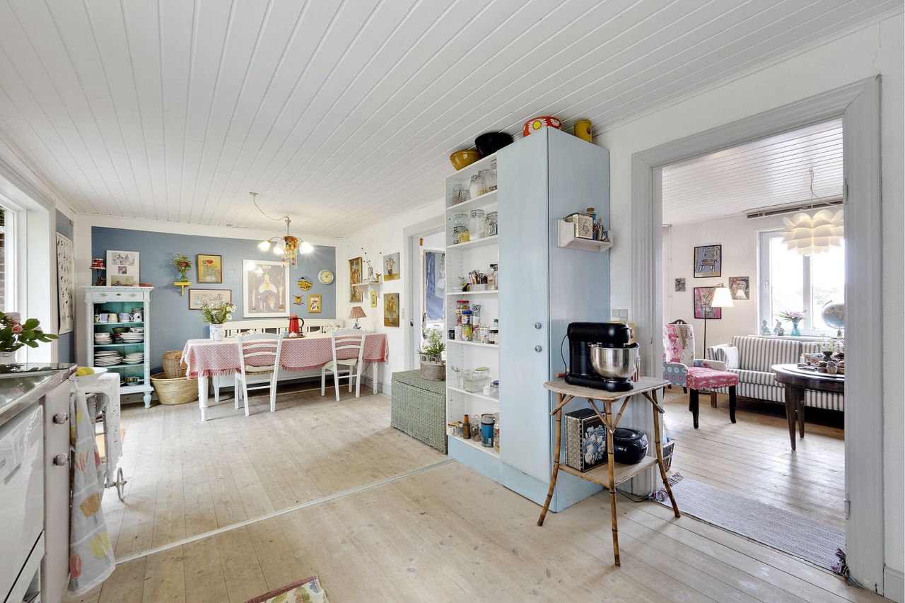 Stueplan er indrettet med entre, stor stue med flotte trægulve, brændeovn og trappe til 1. sal. Stort