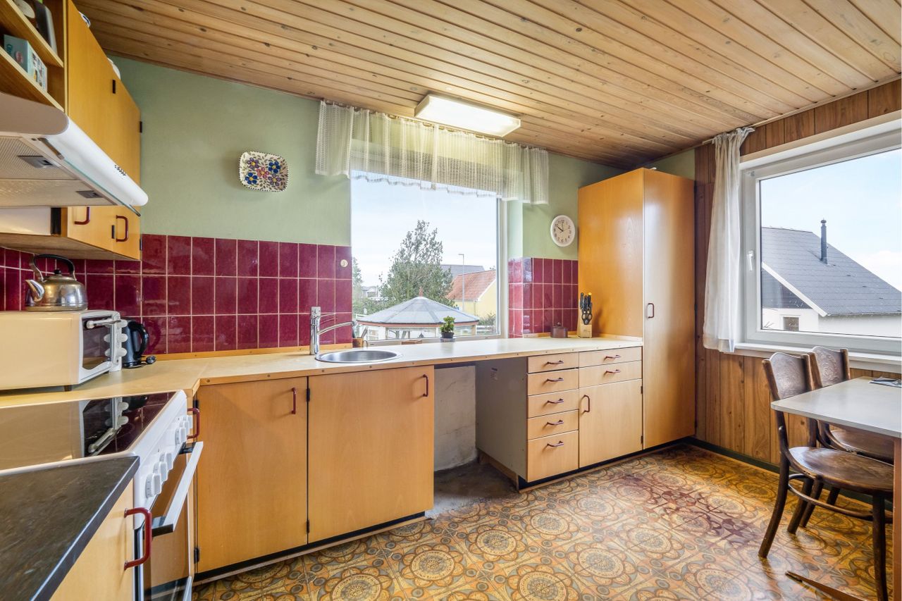 Villaen er opført i 1974 med en tidstypisk facade af gule sten og kvadratiske vinduespartier i hvide