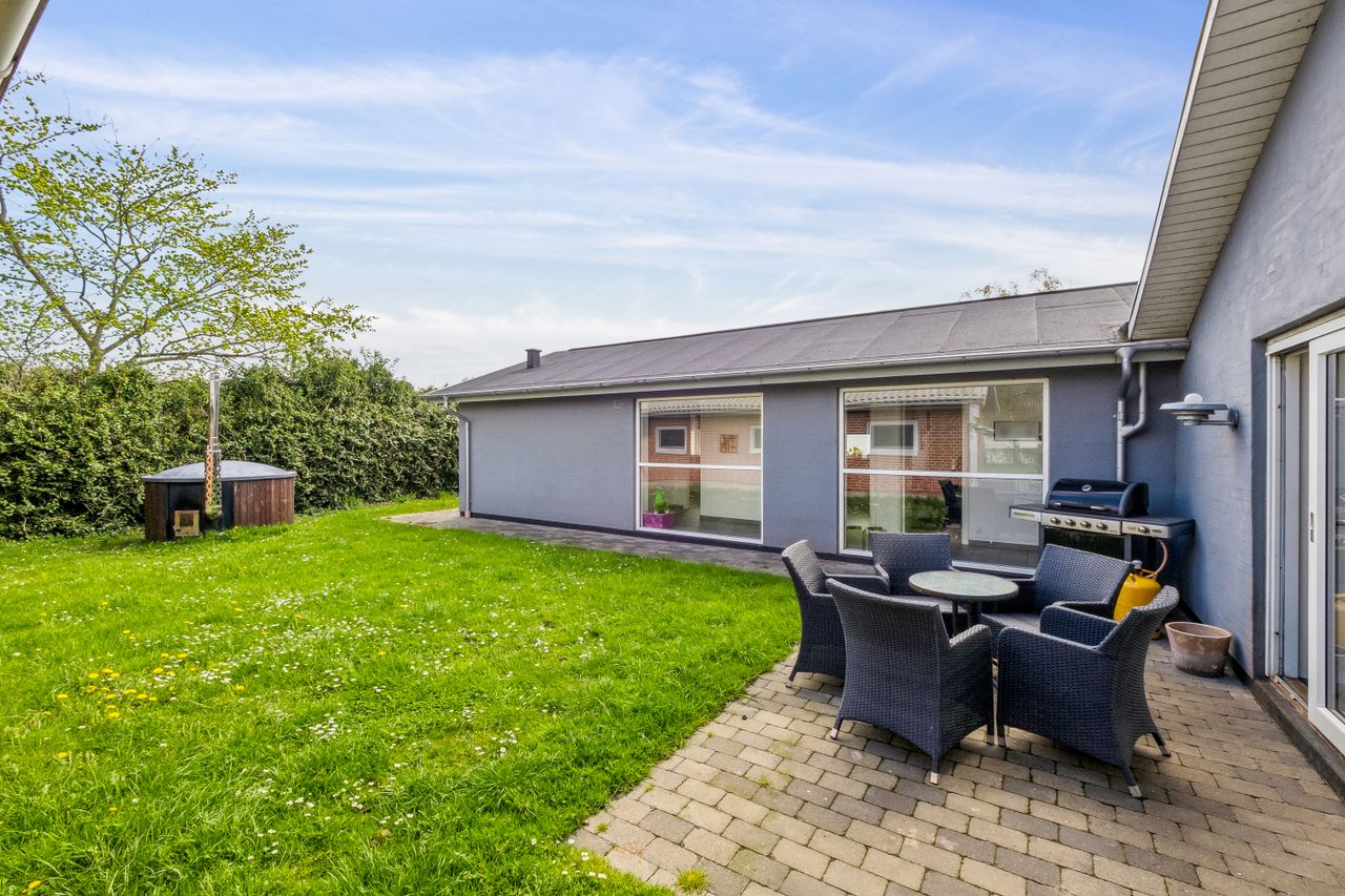 Velkommen til Skånings Alle 16 - en renoveret villa i 1 plan på lukket vej tæt på havn, strand og indkøb - Her får I en rummelig villa med 221 m2 med plads til hele familien eller gæster.
