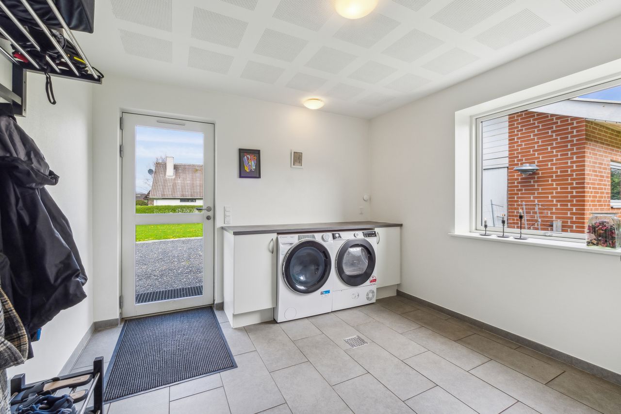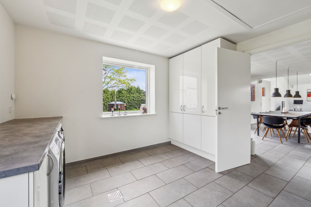 I mødes af det praktiske bryggers, hvorfra I træder ind i husets hjerte - det store køkken alrum med delvis loft til kip, ovenlysvinduer, gulvvarme og god akustik, samt udgange til gode udearealer med bla. flisebelagte terrasser på øst og vestside af huset, hvor der kan slappes af og hygges. Soveværelse, walk-in/kontor og badeværelse.