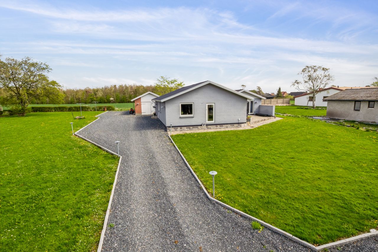 Have med plæne, grusbelagt indkørsel, samt garage.