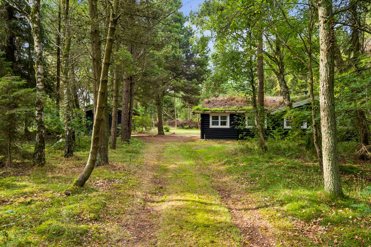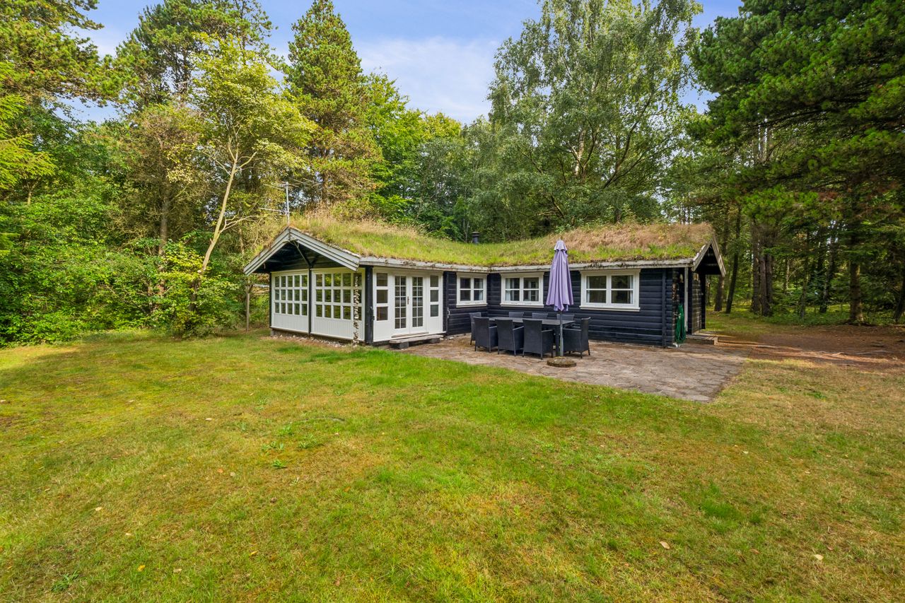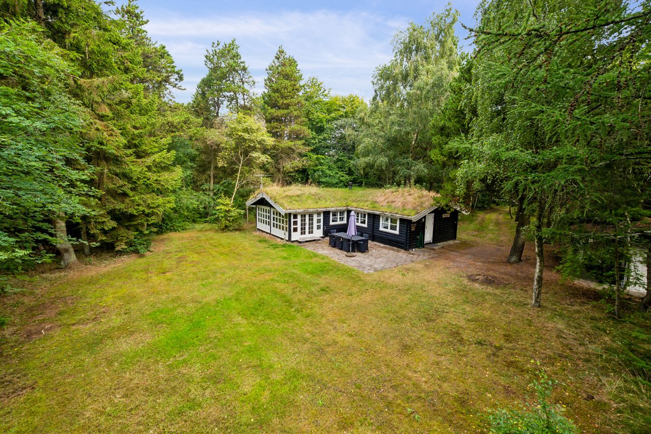Jeres nye fristed indhylles af skovens dybe, stille ro. Høje træer indrammer den 2.500 m2 store naturgrund, og midt i den grønne kulisse ligger huset og camouflerer sig så fint med sit matchende grønne tag. Huset er billedet på vaskeægte sommerhusidyl, for I overtager et sortmalet bjælkehus med hvide, småsprossede vinduer.